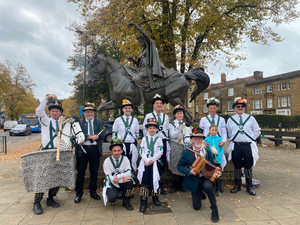 Our annual October celebration in memory of the Hobby Horse Festival has come around again! A team of eight dancers and two musicians danced in and around Banbury over the course of Saturday lunchtime providing entertainment to shoppers. We assembled at the White Horse before heading down to the Fine Lady statue, near to Banbury Cross. Having recited the Fine Lady poem, we started with ‘Sweet Jenny Jones’ and ‘Haste to the Wedding’. A crowd started to gather, so we decided to get everyone joining in with a ‘Shepherds’ Hey’ jig. We had a member of the public for all eight members of the team and we had great fun getting everyone to join in with our tradition.