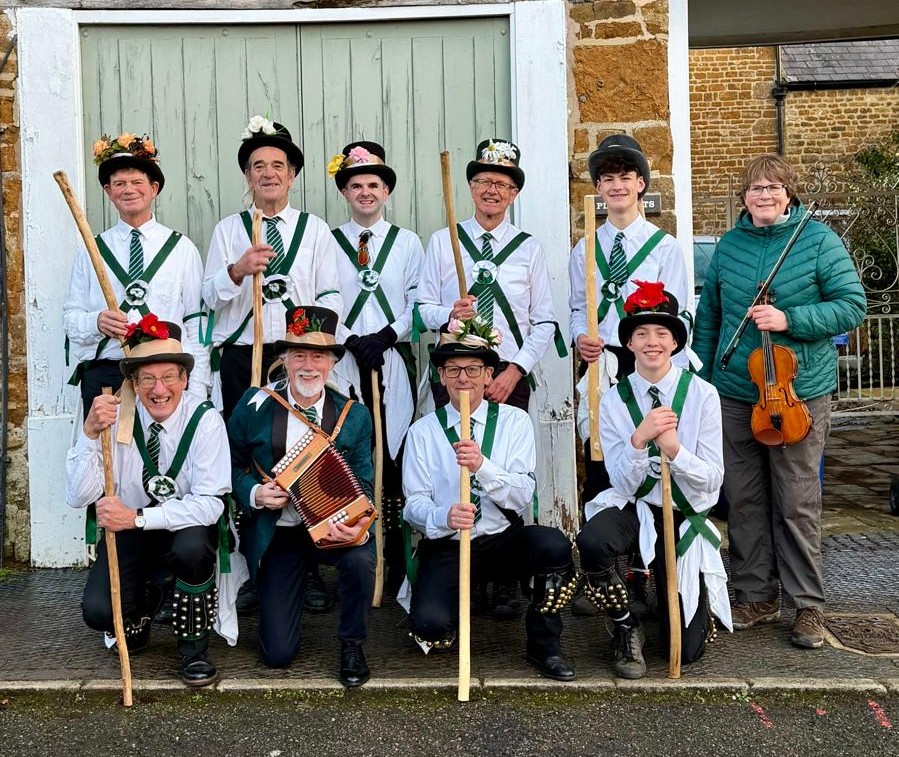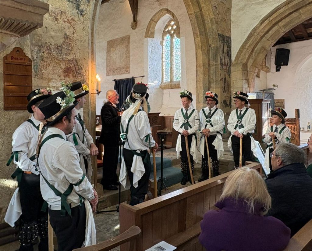 On Sunday morning at Hornton Parish Church we were asked to perform in a very different environment viz. to present Donald’s powerful Story of the Dancer as the central part of a church service. Once again, we were able to field eight dancers, although only three of these had performed on the day before. This team were thus less experienced overall than Saturday’s side. Indeed three of them had never previously appeared in this powerful story of dancers drawn into the tragic events of World War 1. Since the performance required us to dance some of our less frequently performed numbers such as Happy Man and The Buffoon, Squire Ryan had to marshal his troops with his customary wisdom. In addition the very narrow aisle of this tiny church created challenges for all the dancers, particularly in performing Heys. The congregation were unanimous in their praise afterwards and the vicar asked us if we would consider repeating the show at one of the larger churches in the benefice next year, to which the answer was, of course, affirmative. As I left the still packed church, Donald was fielding questions about the various sources for his wonderful story, Ryan was attempting to teach an enthusiastic parishioner the rudiments of Shepherd’s Hey and the rest of the side and our supporters were enjoying coffee and biscuits.